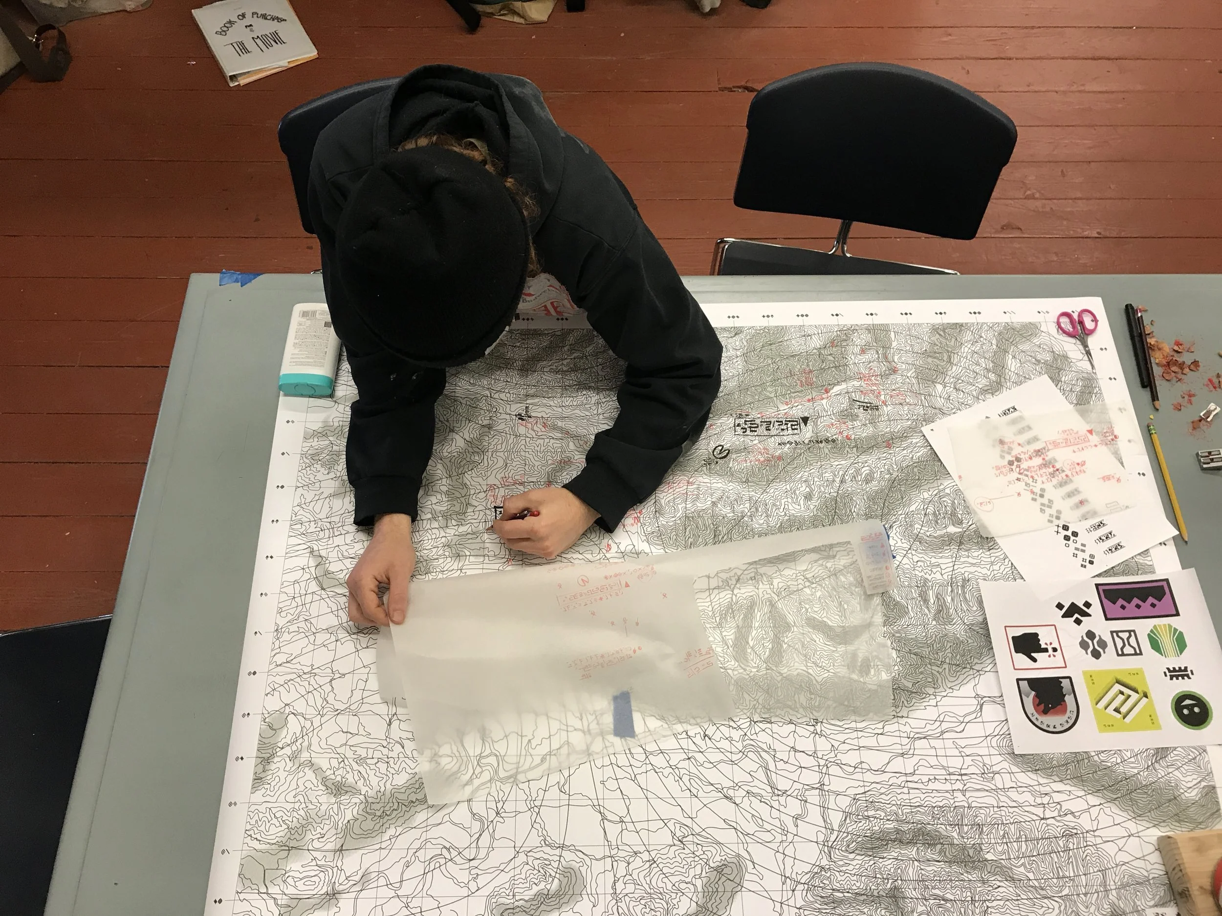 Then we could begin implementing the designs into digital files that would be printed in various mediums and treated to bring them to life. A particular prop that required many hands, was the map that the main character holds. I drew it based off the landscape of the shooting location, we then printed it on waterproof banner material, to give it that future feel, and ready for a rugged landscape. Then our illustrator made handwritten notes on it in the language of the film. Then we dragged it on the ground, rubbed it in dirt, and roughed it up to give viewers the feeling it was well-worn.