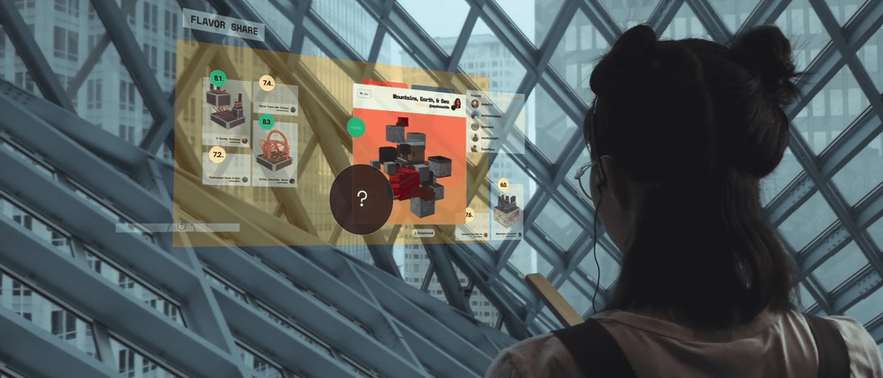 After researching contemporary social media platforms like Instagram and Reddit, I created a simple interface made to exist in 3D space in layers that uses simple visual language reminiscent of today’s social medias, with a near-future twist that showcases the 3D flavour substrate technology created for this film and a future where that technology is open-source.